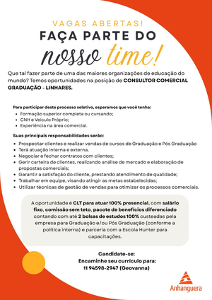 Que tal fazer parte de uma das maiores organizações de educação do mundo? Temos oportunidades na posição de CONSULTOR COMERCIAL